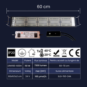 • Lampa LED cu un design elegant, se poate sprijini pe marginea acvariului dar se poate folosi si suspendata de tavan sau suport. Setul de agatare este inclus