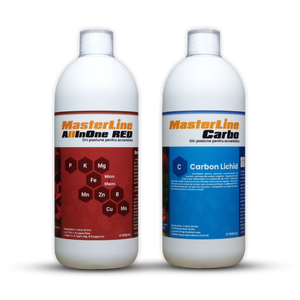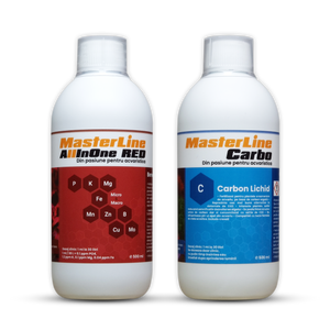 MasterLine All In One Red contine toate elementele nutritive necesare plantelor (dar fara nitrat), intr-un singur flacon: 0.1% P , 3.6% K, 0.3% Mg, 0.12% Fe, 0.036% Mn, 0.023% Zn, 0.021% B, 0.005% Cu, 0.003% Mo