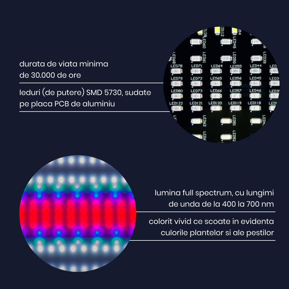 • Spectru complet de lumina cu lungimi de unda de la 400 nm la 700 nm, exact ce au nevoie plantele pentru a creste sanatos