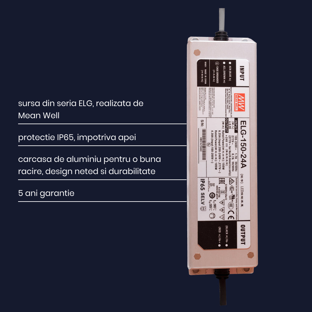 • Sursa de alimentare din seria ELG este realizata de Mean Well (printre cei mai buni producatori de surse). Are protectie IP65 impotriva apei. Ofera LED-urilor o putere constanta si de inalta calitate. Are carcasa metalica pentru o racire buna, design neted si durabilitate. 5 ani garantie inclusa