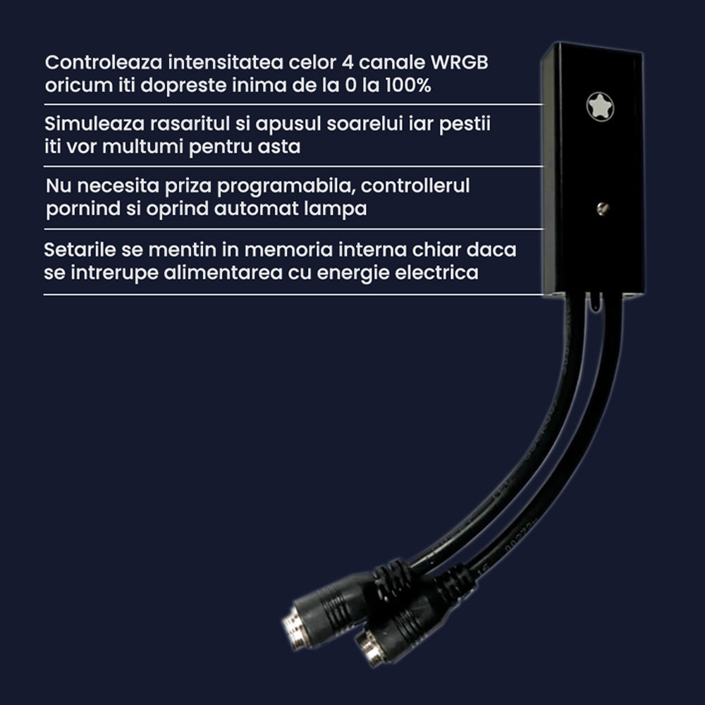 • Cu aplicatia mobila puternica compatibila cu iOS si Android, exista o multime de posibilitati de a-ti controla iluminarea acvariului. Regleaza cele 4 canale de culori (WRGB) si intensitatea luminii in orice mod doresti, pentru a obtine aspectul perfect pentru propriul gust