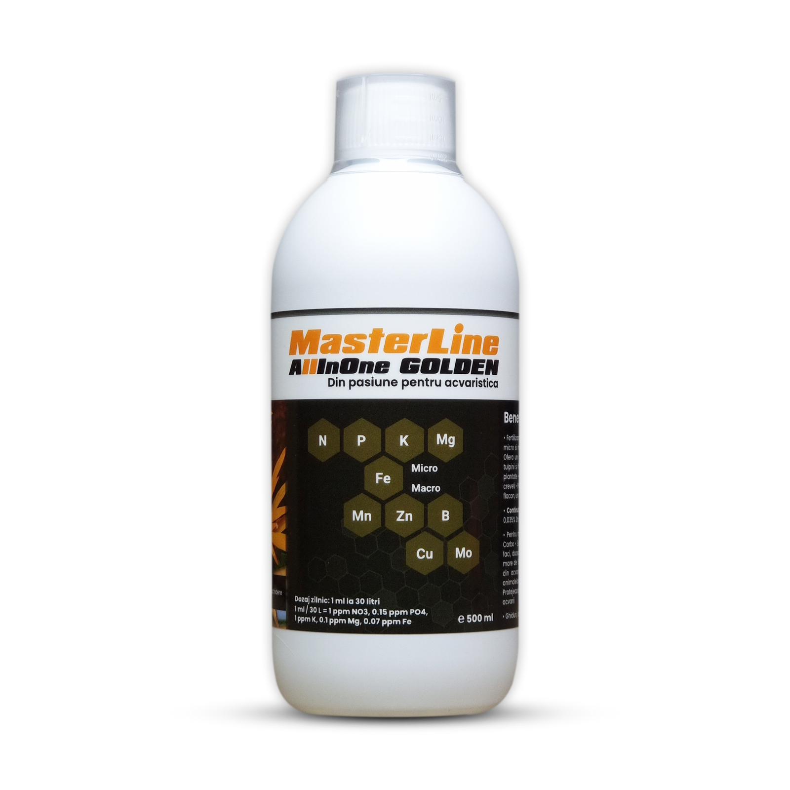 MasterLine All In One Golden contine toate elementele nutritive necesare plantelor, intr-un singur flacon: 0.68% N, 0.15% P, 3% K, 0.3% Mg, 0.21% Fe, 0.055% Mn, 0.035% Zn, 0.032% B, 0.007% Cu, 0.005% Mo